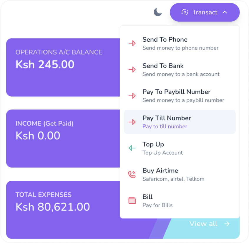 Easily pay through our flexible bill payment system using M-PESA options such as Paybill, Till number, or sending directly to a phone number, as well as bank transfer.